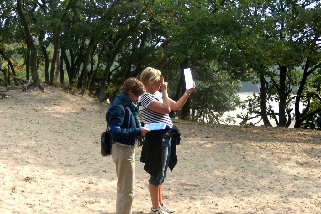 Het programma begint met een korte uitleg. Onderdeel daarvan is een zoektocht naar De Zwerver. Dit is een ‘single’ ofwel een ’traditional’. Dat is de meest basale cache, het type waarmee het spektakel ooit begon. De opdracht is eenvoudig. Je loopt met de GPS direct naar de schat toe, die je natuurlijk nog wel moet zien te vinden. Niet ingewikkeld, maar goed om te leren omgaan met een GPS en te begrijpen wat geocaching is.